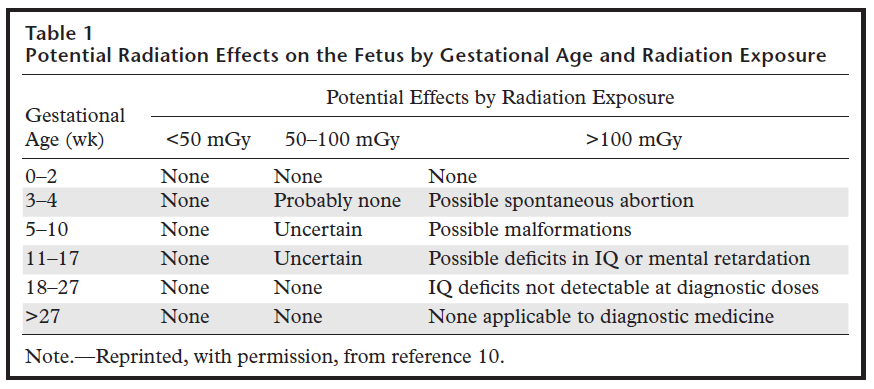 Este de preferat amânarea unei examinări cu radiații ionizante pentru după naștere sau cât mai târziu posibil în cursul sarcinii. Este de evitat examinarea în primul trimestru de sarcină, mai ales dacă se pot efectua examene non-iradiante (ecografia, IRM)