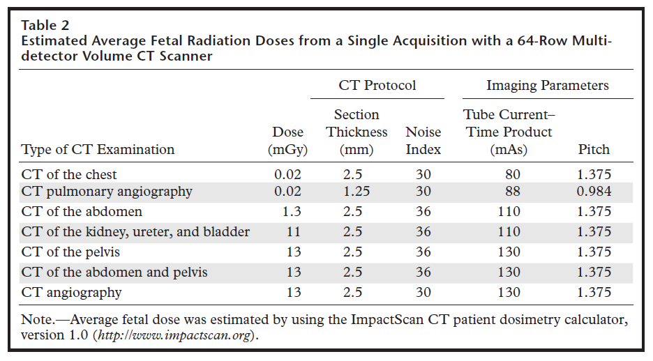 Dacă nu este posibil, efectuarea investigației se va face cu stricta respectare a principiului optimizării dozelor. În practică, riscurile se discută în cazurile examinărilor CT ale abdomenului și pelvisului, iar studiile efectuate arată că în aceste cazuri crește riscul malformațiilor fetale cu maximum 3%, în special la doze mari, care nu sunt atinse de obicei în timpul examinărilor CT standard.